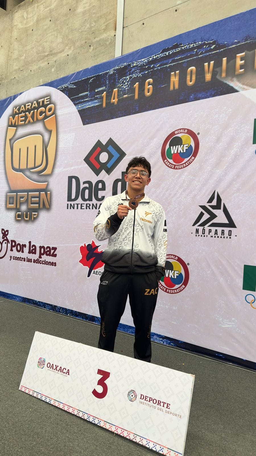 Zacatecas., Zac. 16 de Noviembre 2025.- Zacatecas con Metztli Escobedo Castañeda, Melina Frías Cabral, Gustavo Rangel Rangel y Ricardo Escalera con dirección técnica de Luis José Medina Fuentes, obtuvo 4 preseas doradas, 2 de bronce y un quinto lugar, en la Copa de Karate Oaxaca 2025 y Selectivo Nacional rumbo al Campeonato Centroamericano Nicaragua 2026.