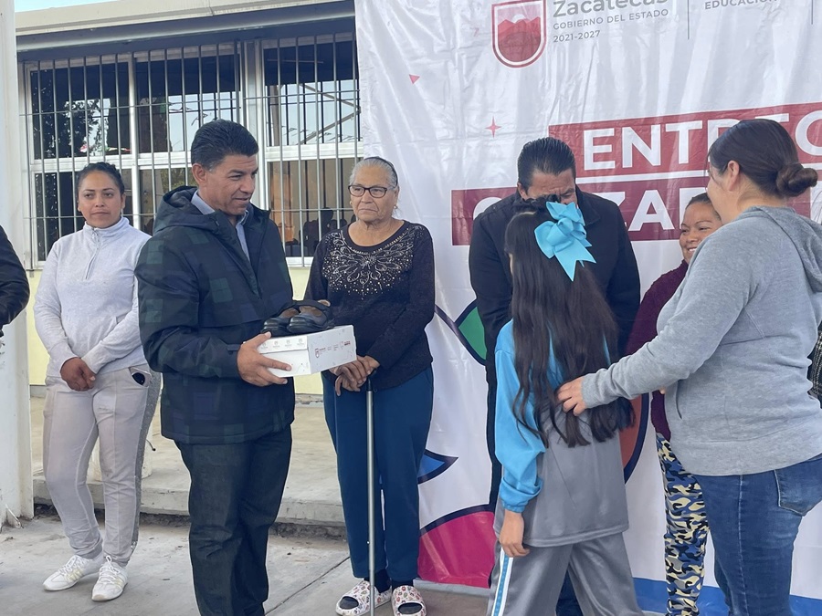 Zacatecas., Zac. 25 de Noviembre 2025.- En la comunidad de Santiaguillo, en Fresnillo, Zacatecas, se realizó la entrega de calzado escolar a las y los alumnos de la escuela primaria José María Morelos. Esta acción reafirma el compromiso por fortalecer la educación y apoyar a la niñez, proporcionando condiciones que favorezcan su asistencia y participación en el ciclo escolar.